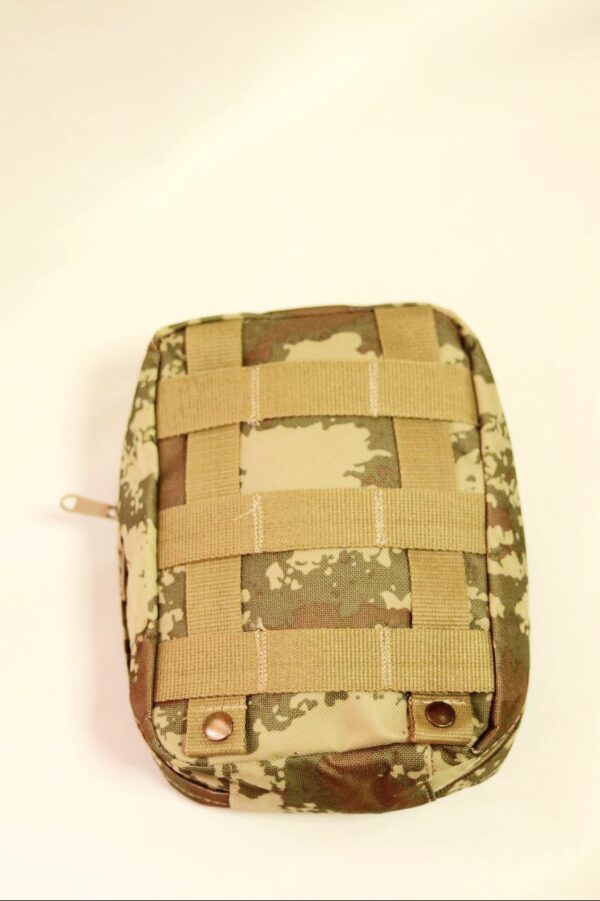 - The pouch includes pockets and compartments for items such as bandages, antiseptics, pain relievers, tourniquets, scissors, and other essentials.